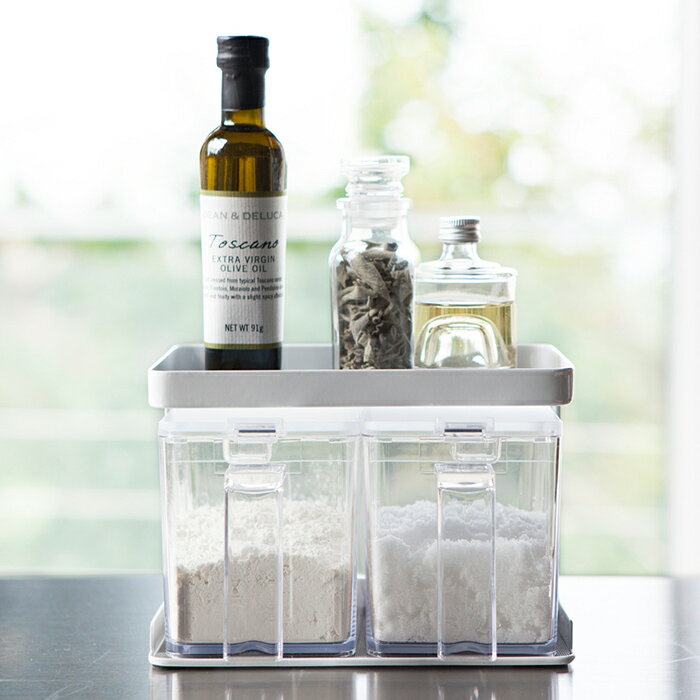 「調味料ストッカー&ラック」は、お砂糖や塩などの調味料を入れるストッカー2個と、それを収納できるミニラックがセットになったキッチン収納。